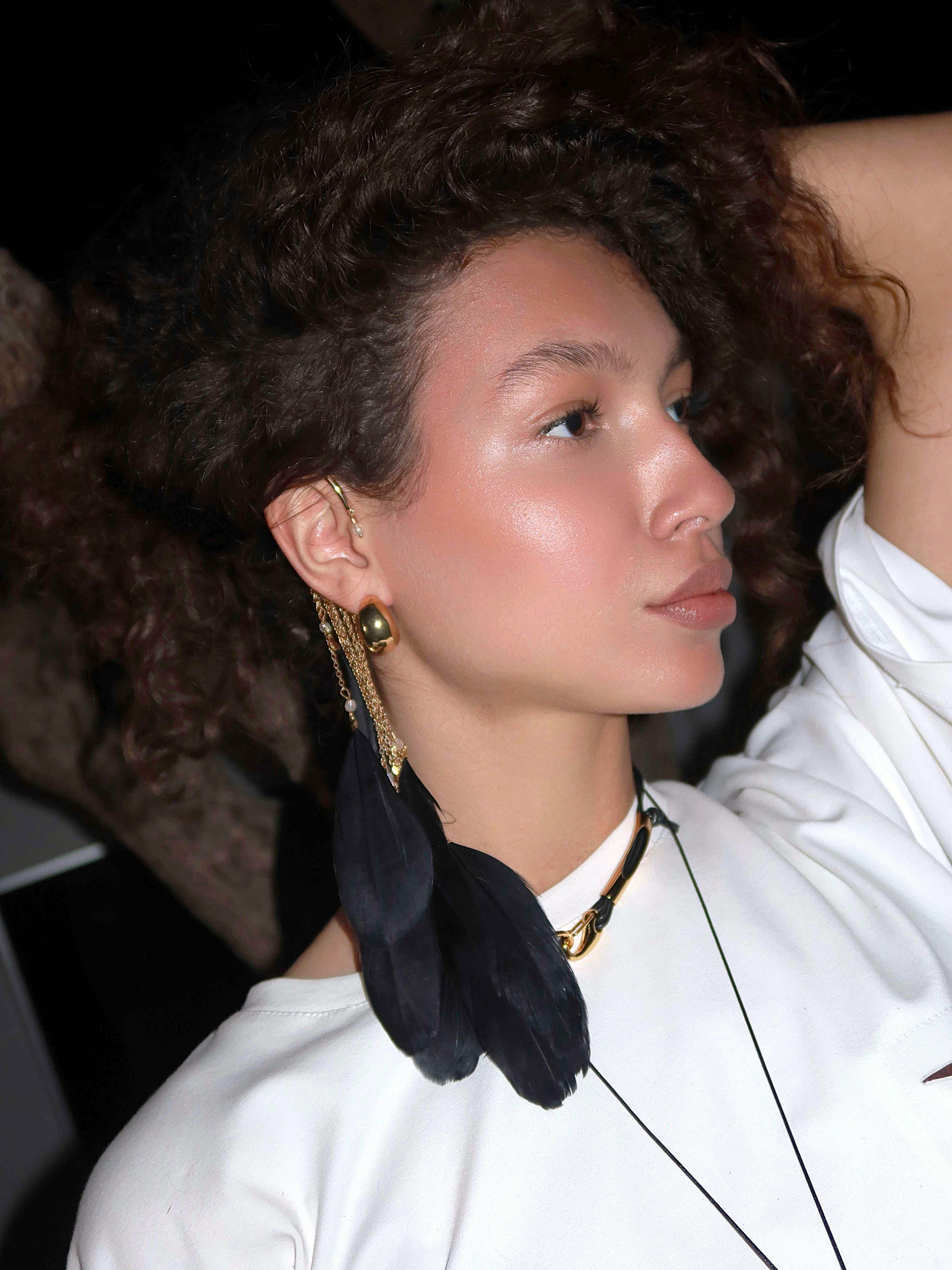 Эффектный кафф в этническом стиле с цепочками, кристаллами и перьями